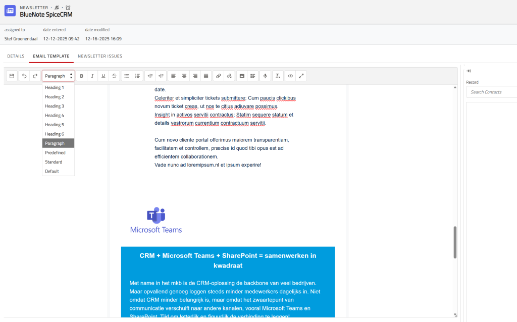 SpiceCRM biedt krachtig marketingmanagement: campagnes creëren en automatiseren, leads kwalificeren en nurturen, e-mailintegraties met templates en tracking, ROI-analyses en segmentatie voor gepersonaliseerde outreach; inclusief een krachtige nieuwsbriefeditor standaard inbegrepen voor het eenvoudig ontwerpen van professionele nieuwsbrieven met drag & drop.