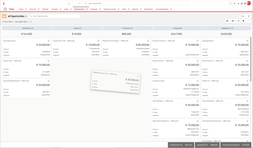 SpiceCRM biedt geavanceerd opportunity management: kansen volgen in een visuele pipeline, stages beheren met drag & drop, prognoses maken en alle relevante info centraal houden voor een strakke salessturing.